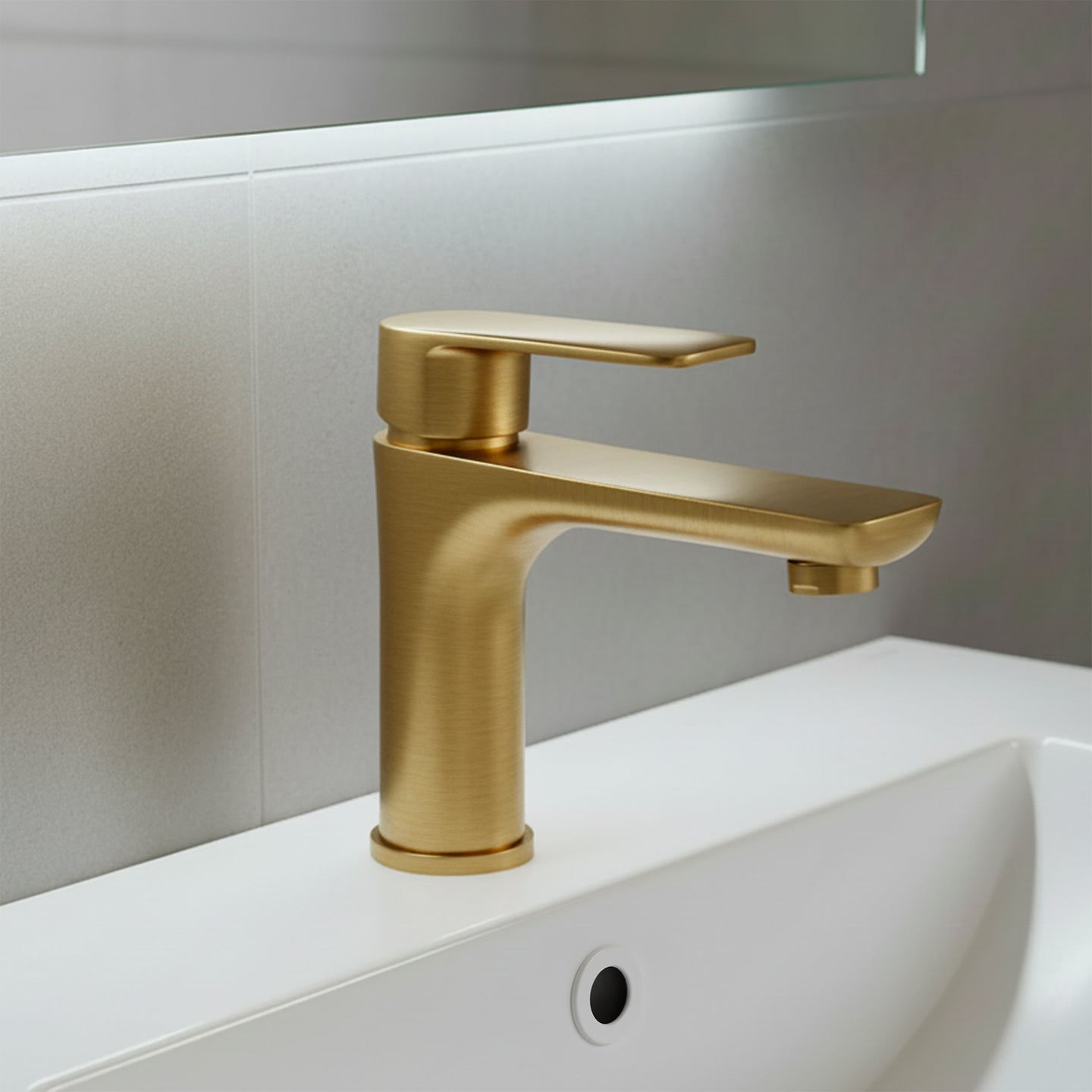 Mitigeur de salle de bain Arko en laiton massif, disponible en chromé, noir mat, doré brossé et rose gold brossé. Design contemporain, durable et élégant.