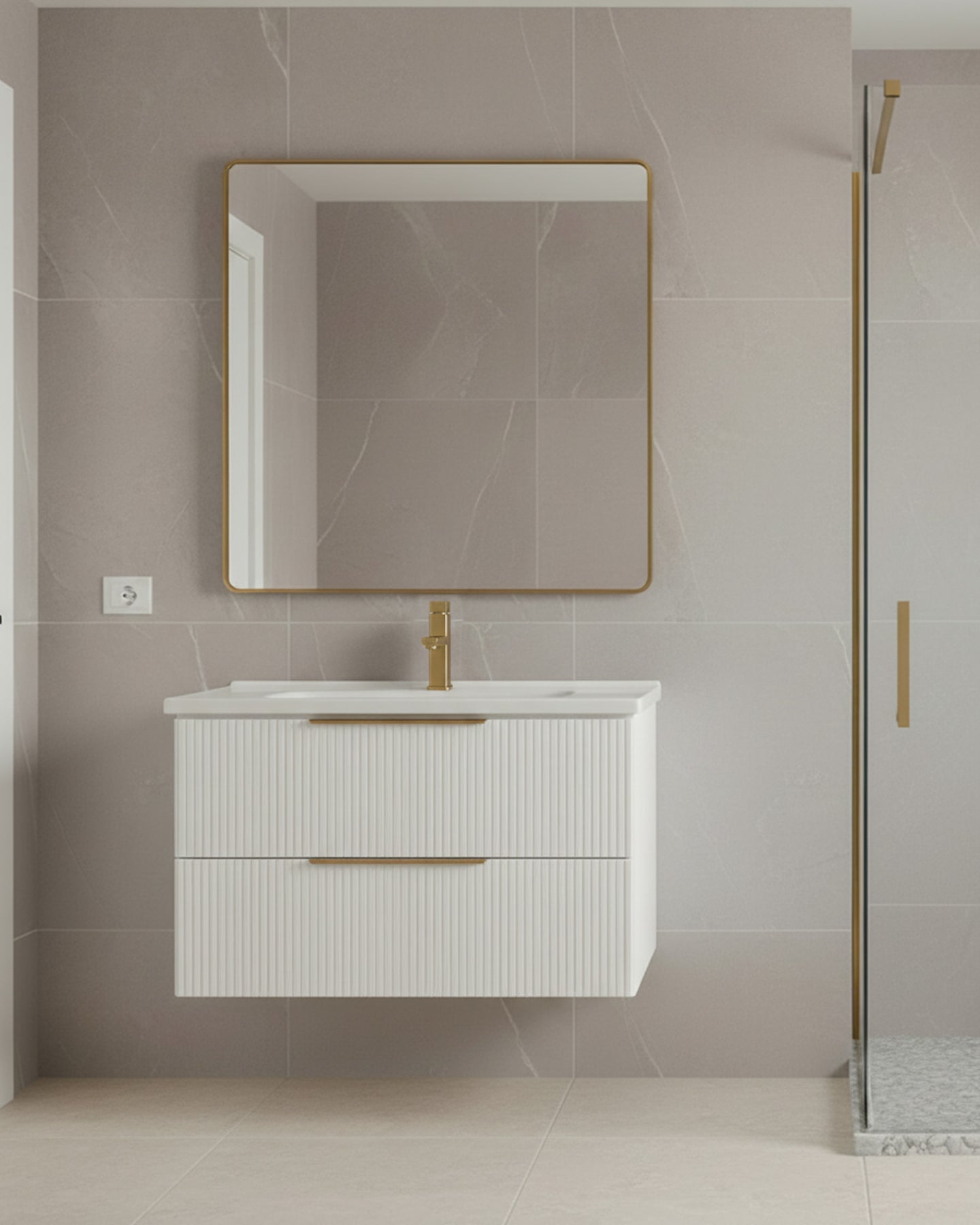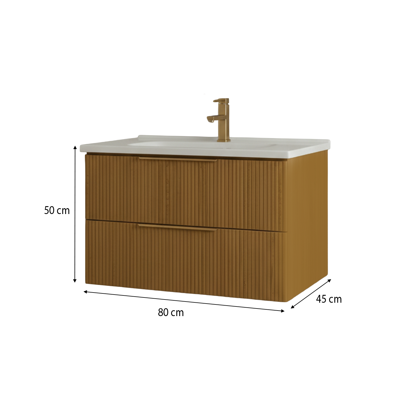 Meuble de salle de bain 80 cm avec façades cannelées et vasque intégrée. Disponible en bois peint brun ou blanc. Livré monté, idéal petit espace.