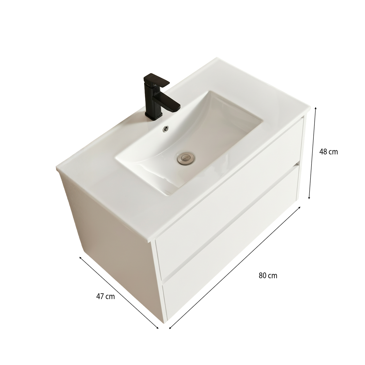 Meuble de salle de bain 80 cm blanc avec vasque intégrée. Format compact, rangements optimisés, livré monté. Idéal pour petite salle de bain ou salle d’eau d’invités.