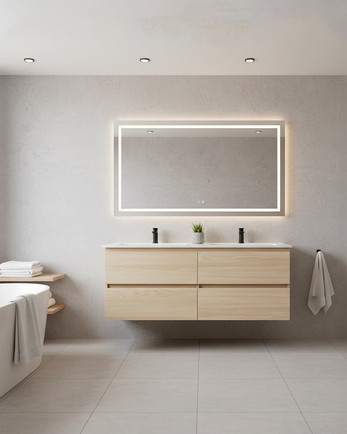 Conçu comme un meuble double vasque équilibré et fonctionnel, Soren structure l’espace avec élégance tout en conservant une lecture visuelle légère. Il s’intègre naturellement dans des projets contemporains, lumineux et naturels, et répond parfaitement aux besoins des salles de bain familiales ou partagées, où confort, organisation et fluidité d’usage sont essentiels.