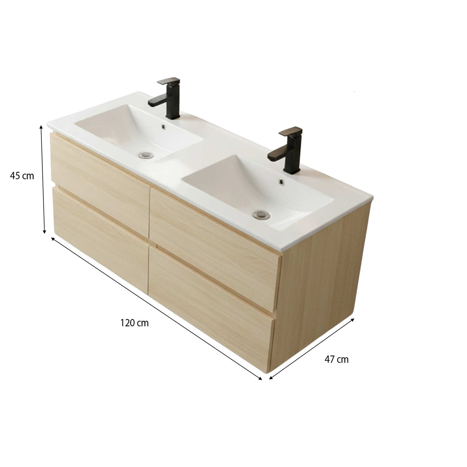 Meuble de salle de bain double vasque 120 cm en bois clair avec vasques intégrées. 4 tiroirs de rangement, livré monté. Idéal pour salle de bain familiale ou partagée.