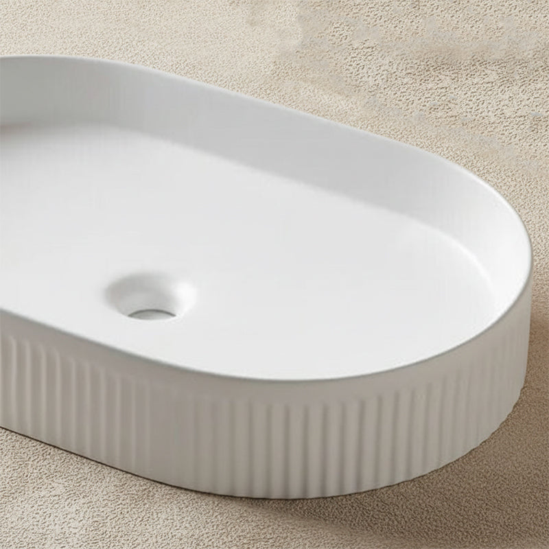 Vasque à poser ovale cannelée en céramique blanche 59,5 × 37,5 cm. Design élégant, relief cannelé, entretien facile, idéale pour une salle de bain contemporaine.